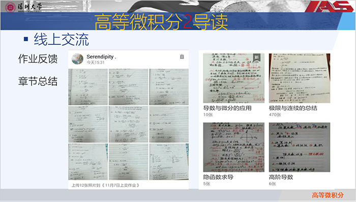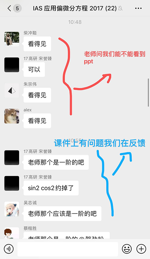 贺劲松老师课前先让同学们看了一遍相关的网课和课本内容,使他们对应用偏微分方程有了一定的理解。课上,他一边在腾讯课堂以课件+语音的方式直播,一边密切关注着微信课程群,时刻了解学生的接受程度以及问题反馈。此外,他还布置了一些课堂的习题作业,让学生同步完成并为他们答疑解惑。同学们纷纷表示,“线上听课,知识点更好理解了。”