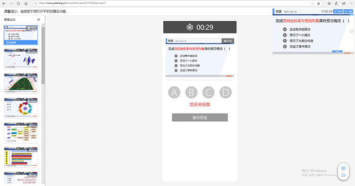 宣本金老师选择使用雨课堂平台讲解“高等微积分(2)”。他在课前要求学生们预习课程内容,并在课上进行答题展示和作业反馈,同时通过讨论区发言、弹出投票问题等方式与同学们积极互动,课堂氛围非常活跃,教学互动效果较好。