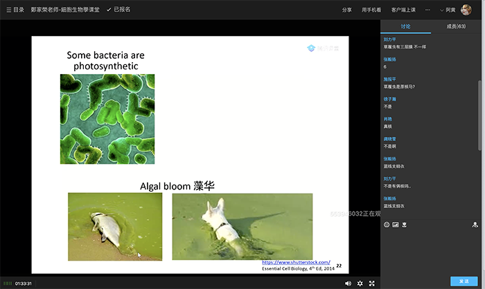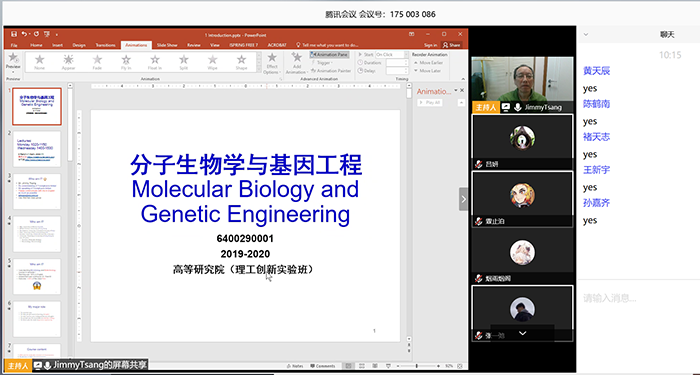 高等研究院的曾绍雄老师采取超星学习通+腾讯会议双平台模式,为大家讲了“分子生物学与基因工程”的第一课。课前,他用学习通提前公布课件和预习内容,课后又在学习通上布置和收集作业。他还采用开启摄像头并共享屏幕的形式直播授课,学生可以同时看到教师本人和PPT课件,更有上课的观感。课程一开始,曾老师便表示,自己的课堂是“100%全英授课,过往挂科率较高”,让全体同学瞬间精神紧张起来,接着再用中等语速慢慢地讲起了课程内容,不时停下来详细解释,促进大家对上课内容的理解。