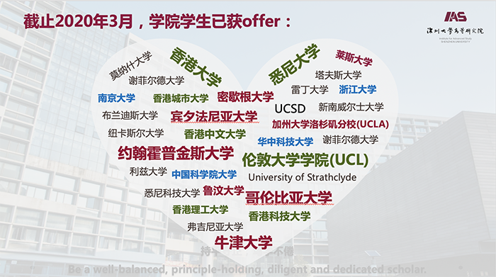 目前,高研院的人才培养效果与人才培养目标较为吻合。60%的2019届毕业生进入境外知名高校深造,20%留在本校或进入境内知名大学读研,20%进入知名企业工作或创业。据不完全统计,2020届目前已有不少学生陆续拿到牛津大学、加州大学伯克利分校、约翰霍普金斯大学、宾夕法尼亚大学、杜克大学、布朗大学、哥伦比亚大学、加州大学洛杉矶分校、麻省大学罗威尔分校、香港科技大学、香港城市大学、香港理工大学等境外知名大学硕士或者博士录取。