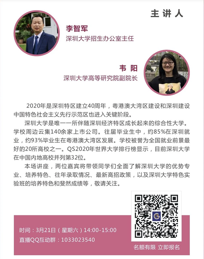 2020年是深圳特区建立40周年,作为一所伴随着深圳经济特区成立起来的综合性大学,深圳大学一直牢牢地吸引着全国人民的目光。高考前夕,深圳大学招生办公室主任李智军和高等研究院副院长韦阳特意为全国各地的6000多名学生和家长带来了一场内容详实、生动有趣的招生在线讲座,系统地介绍了深大的学校特色、往年录取情况、招生政策,以及高等研究院特色实验班的培养特点和斐然成绩。