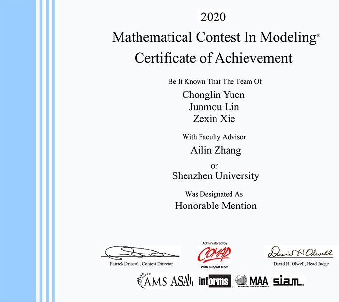 2020年,美赛于美国东部时间2月13日至17日和3月5日至9日举行。众多队伍中,来自深圳大学的学生队伍荣获特等奖提名奖6项、一等奖15项、二等奖43项。其中,高等研究院26位学子参与的队伍成功斩获1项特等奖提名奖(占学校获奖比例的17%)、3项一等奖(占学校获奖比例的20%)和8项二等奖(占学校获奖比例的19%),成绩喜人。