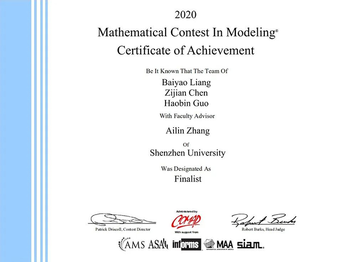 近日, 2020年美国大学生数学建模竞赛成绩揭晓,深圳大学高等研究院的一众学子获得了相当亮眼的成绩。学院一共有26位学生加入12支队伍参赛,并荣获特等奖提名奖1项、一等奖3项和二等奖8项。其中,由学院2018级学生梁柏耀作为队长带领的队伍获得了特等奖提名奖(占总数的前2%)。
