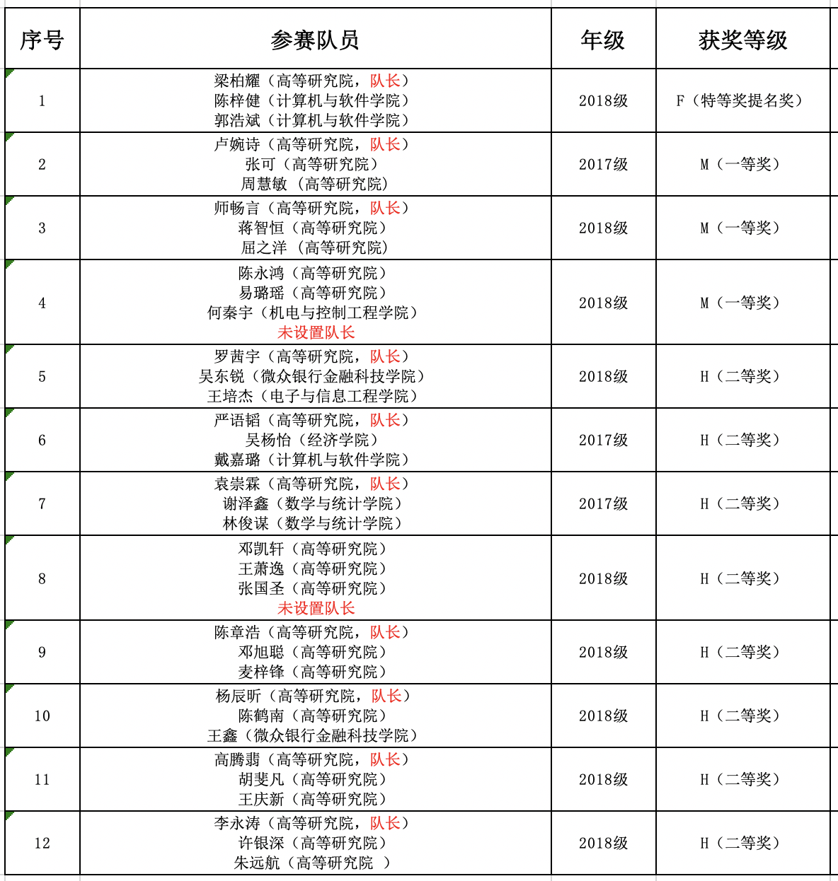(图:高等研究院本次参赛队伍的获奖结果)