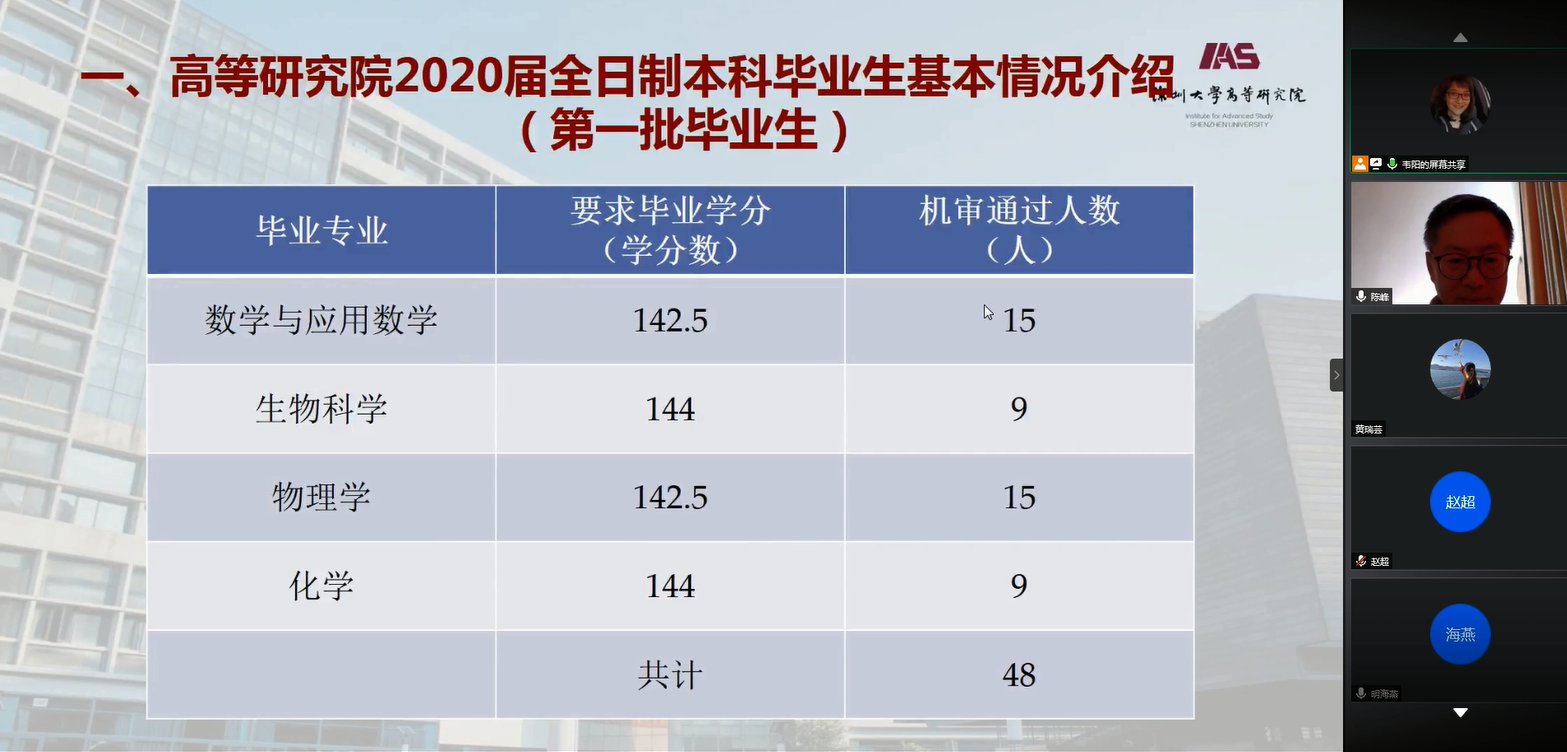 副院长韦阳博士首先介绍了高等研究院2016级“理工创新实验班”第一批毕业生的基本情况、本科生培养方案和荣誉学士拟申请名单相关情况。根据《深圳大学学位条例实施方法》有关规定,参会委员按照相关程序要求对我院“理工创新实验班”2020届毕业生学士学位资格进行审核,并以无记名投票方式在微信群投票表决授予的学位申请。会议最终决定拟授予陈锦锐等 48名本科毕业生学士学位,并报校学位评定委员会审议。