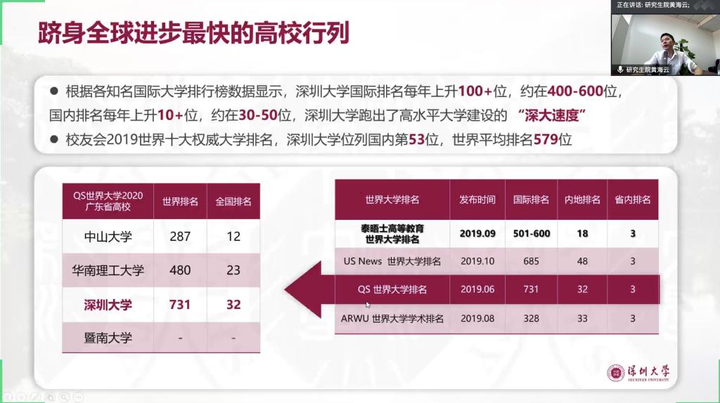 紧接着,研招办副主任黄海云老师向同学们介绍了深圳大学的整体情况和招生情况。他先是讲述了深圳大学的建校背景、学科门类体系、师资力量、科研实力、产学研合作成果、国际交流情况、学生就业情况;再罗列了近几年深圳大学的世界排名和国内排名,表示深圳大学跑出了高水平大学建设的“深大速度”;并展示了依山傍水的校园风光、设备先进的教学实验室环境和温馨舒适的居家式宿舍。在招生情况方面,黄海云老师介绍了深圳大学2021级硕士研究生的奖助体系,详细解读了教育部关于今年推荐优秀应届本科毕业生免试攻读研究生的推荐、接收录取工作的通知文件。最后,黄海云老师公布了深圳大学2021年招生计划中的预计招生总人数,包含全日制学术学位1400人,全日制专业学位2400人以及非全日制专业学位500人,鼓励广大学生报考深大,与深大一起成长。