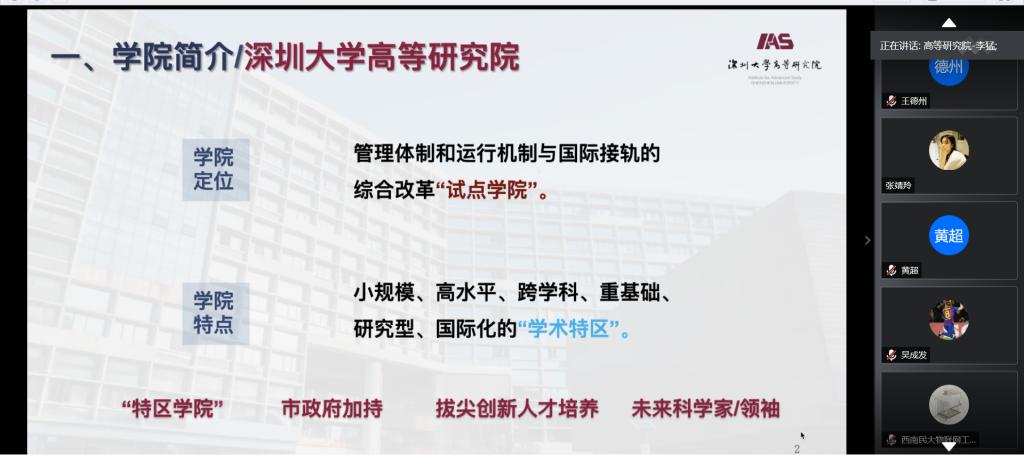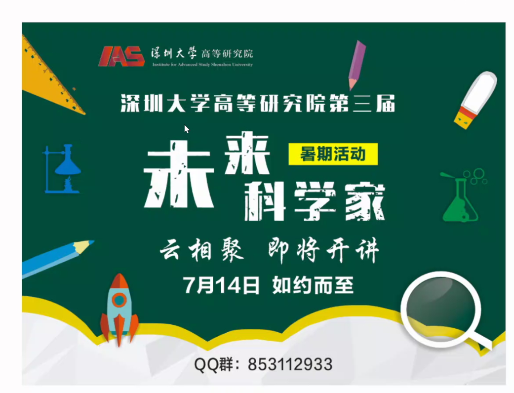 为使更多优秀应届生了解深圳大学和高等研究院的研究生招生工作,高等研究院已连续举办了两届线下的暑期学校活动。7月14日上午9点,学院通过腾讯会议的形式,在线举办了一场别开生面的2021年“未来科学家”暑期平台“云相聚”活动,吸引了近百人观看视频直播。
