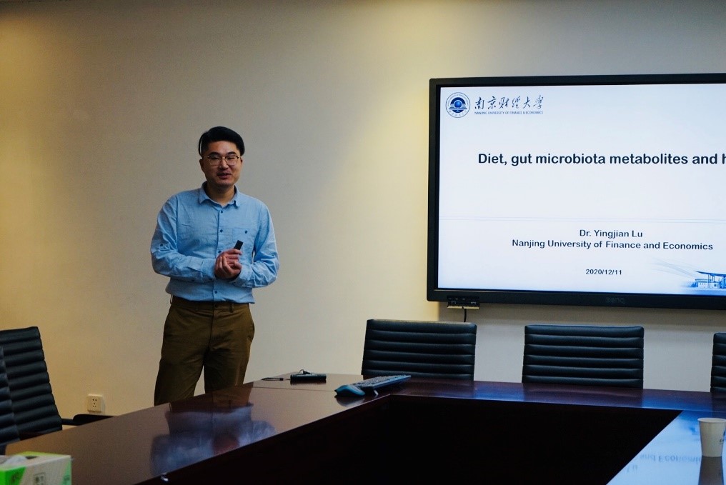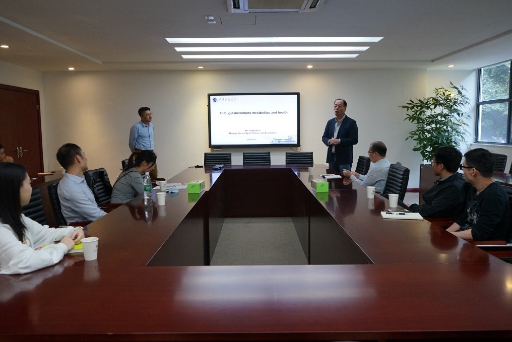 15:30分, 陆颖健教授在汇元楼103会议室进行了题为“Diet, gut microbiota metabolites and health”的学术报告。近年来的大量研究证实饮食是影响肠道菌群组成和结构及其代谢产物的重要因素,也是最容易改变和控制的因素,饮食成分中的碳水化合物、蛋白质、脂肪等均可被肠道微生物不同程度地分解利用。陆教授针对自己的研究方向,从三个方面介绍了其研究内容:肠道微生物的研究背景;饮食,肠道菌群与人体的营养、免疫、代谢、疾病等诸多生理功能之间的相互作用关系;目前的研究成果。陆教授课题组也通过大量的研究实验证明了饮食干预引起的人体肠道微生物的组成和代谢改变对调节人类健康和预防疾病有着不可忽视的重要性。
