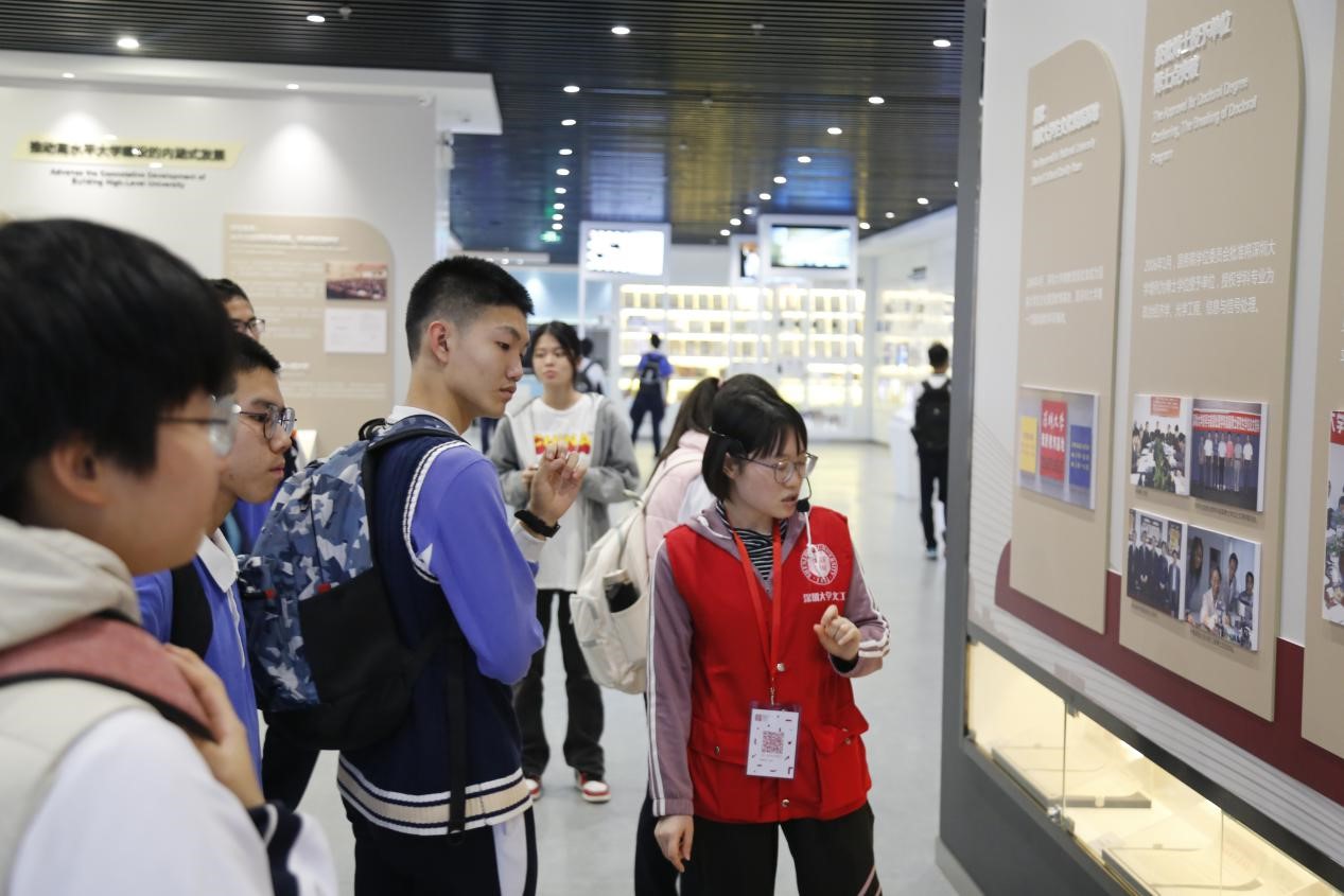 最后,同学们一起参观了深圳大学校史馆。在讲解员的带领下,同学们参观了大量的档案史料、实物等。同学们看到了深大建校时被寄予的厚望,看到了深大学科建设的奇迹,看到了深大站在时代潮头的风采。木头的年轮镌刻的是深圳大学艰难又茁壮的成长历程,电子显示屏播放的是将来的期待与目标。此次参观增进了来访者对荔园历史与传统的了解,让他们深刻感受到了深大的文化底蕴。