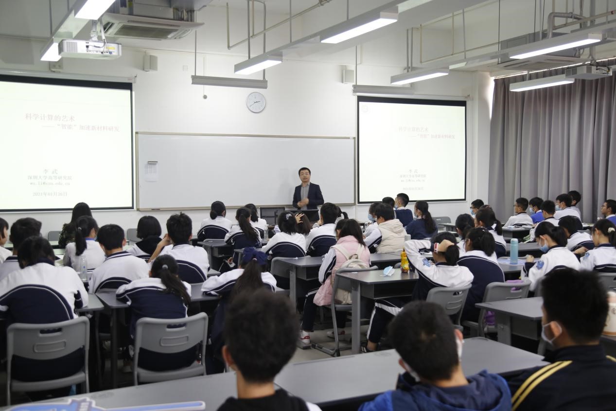 接着,李武博士给同学们带来了一场以“科学计算的艺术-‘智能’加速新材料研发”的学术小讲座,以学生们感兴趣的隐身衣是否存在、如何找到为引,阐述基础研究与科技创新的重要性,鼓励同学们在未来的大学学习和专业选择上,加强基础理论学习,瞄准科技前沿,跟随国家战略,勇攀科学高峰。李老师用诙谐生动的语言浅出深入地为同学们讲解科研的奥秘与乐趣,赢得来访师生的阵阵掌声。