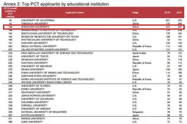 国际专利 PCT 申请量前十的高校中,深圳大学名列第三