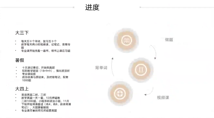 随后是国内升学系列的经验分享。2017级物理学专业的胡梦妮同学首先作经验分享,她的录取院校为深圳大学医学部,她首先向同学们介绍了备战考研时的时间安排,分为基础、强化、重点突破、冲刺四个阶段,告诉同学们做好每月规划尤为重要。同时,胡梦妮同学提到了考研是个持久战,要养成固定作息,管理好自己的时间。此外,她还分享了在备考时期准备的资料,介绍了每年网报、初始、复试以及拟录取的时间安排。