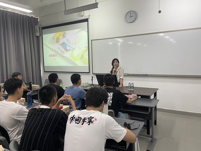 首先,教务赵超老师主要从本科学籍管理规定、学分制选课管理规定和课程考核管理规定三个方面进行介绍,就学分制选课、学院课程结构、成绩与考核等问题进行重点解读。同时梳理了学院对学生的学习要求,毕业和学位的授予条件,让新生们对与自身学业相关的政策、制度以及具体的实施过程有充分的了解。