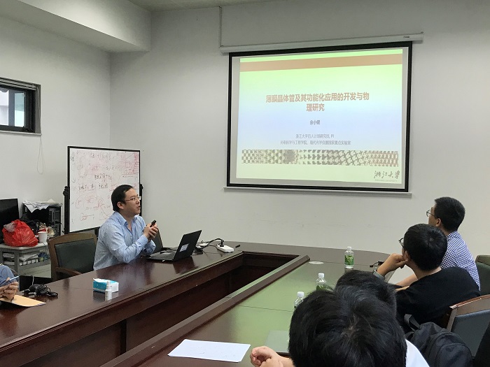 下午3:00,佘小健教授在致腾楼201会议室进行了题为“薄膜晶体管及其功能化应用的器件物理及性能提升”的报告。薄膜晶体管是柔性光电应用的重要器件平台之一。近年来佘小健教授从器件物理、器件设计和器件制备这三方面开展研究,追求高稳定性、高迁移率、高响应速度和低功耗的TFT及其功能化应用。在讲座中,佘小健教授首先简述了栅极聚合物分子结构中的共轭基团为隧穿电流的发生提供量子态载体从而加剧偏压电流衰减效应的器件物理机制,并展现规避该机制实现的高稳定性低功耗有机TFT及其电路应用。然后详述了一种能够实现高速编程的新型TFT非易失性存储器器件的发明。主要通过缩短有效栅控制域尺寸,保证隧穿界面为双极型通道,且维持器件单极型电流电压工作特性这三方面来实现。最后,佘小健教授重点详述了一种重铸界面上钙钛矿晶体结构来去除界面缺陷态结构并抑制离子移动,实现其晶体管常温下可靠工作且具备高迁移率的方法。