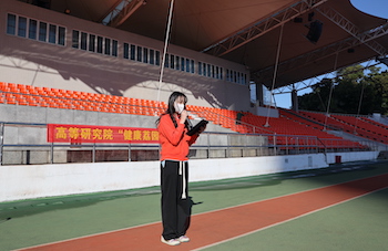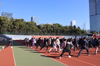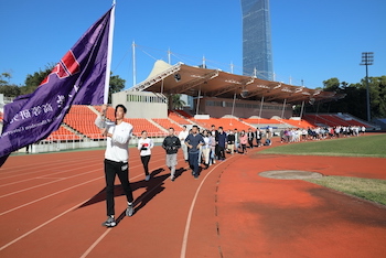 随后,由高研院新生杯篮球新星郑祺同学带领热身运动,现场师生均参与其中。随后,全体师生进行了慢跑运动,由篮球队队长甄毅高举院旗,师生紧随其后。同学们都精神抖擞,展现出了当代大学生应有的青春风采。