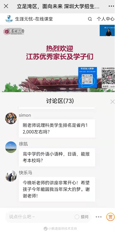 本次直播宣讲内容以“学校介绍+学院介绍+线上答疑”为主。韦老师首先向考生家长们介绍了深圳大学人才培养情况,包含学校成立背景、师资力量、特色专业介绍、人才培养特色、就业去向和前景发展、校园/城市环境、江苏省招生分数等。充分展示了近些年来深圳大学强劲的发展势头和排名提升速度。