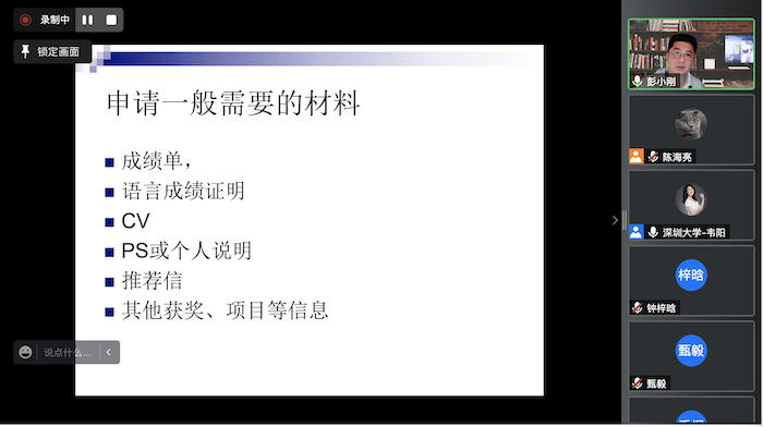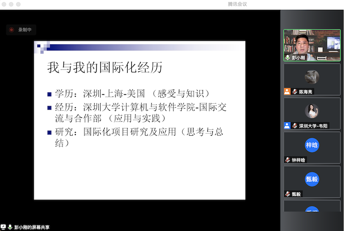 为提升学生的国际化视野,引导学生及早做好生涯规划,3月23日下午13:00,高等研究院组举办了线上“大学生的国际化规划”专题讲座。本次讲座由深圳大学计算机与软件学院副教授彭小刚老师主讲。高等研究院副院长兼党委副书记韦阳、辅导员陈海亮、彭枚芳、各年级学生及家长代表共100余人参加了此次活动。