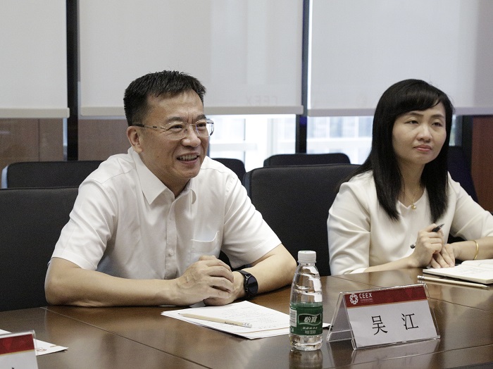 下午14:30,在工作人员的带领下,张学记副校长一行参观了深圳排放权交易所。深圳交易集团副总经理、排交所董事长吴江对深圳排放权交易所的发展历程、公司架构等进行了简要介绍。在座谈会上,张学记副校长介绍了深圳大学的建校历史,学科建设,人才引进等情况,希望通过本次走访行动,为企业注入新鲜血液,输送高质量人才。深圳排放权交易所林殷副总经理介绍了排交所的股东优势、资质荣誉、主营业务等。排交所董事长吴江表示,改革开放以来,在深圳特区高速发展的时代背景下,深圳大学培养了一大批优秀的人才,为特区发展做出了巨大贡献,希望未来有更多的深大学子加入深圳排放权交易所,在环境权益交易市场开疆拓土,共同参与全球生态文明建设。高等研究院陈峰院长、韦阳副院长介绍了高等研究院的建院历程、人才培养特色等情况,作为深圳大学内部探索全面改革创新的学术特区,高等研究院致力于培养交叉学科视野下的国际化创新人才,希望未来能和深圳排放权交易所加强合作,共同助力深圳社会经济转型发展。