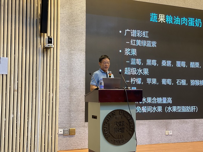 首先,明海燕教授为同学们介绍了血糖、胰岛素的工作机制,并总结了日常饮食的基本原则,包括饮食顺序、“五五饮食法”等,建议同学们餐餐间隔5小时,餐间不摄入任何升糖饮食等。在日常饮食中,每日三餐按照“蔬果粮油肉蛋奶”进行配置,合理摄入优质蛋白,提防花样碳水,坚决回避反式脂肪,做到营养均衡。