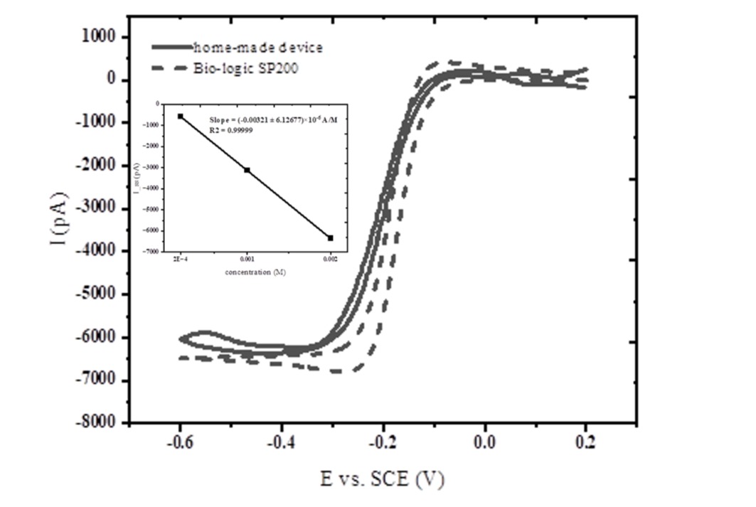 Figure 1 采用本项目原型机所测量的微电极分别在0.2mmol/L、1mmol/L、2mmol/L的三氯化六氨合钌溶液中的循环伏安曲线,及其与法国Bio-logic公司SP200同等条件下测试结果对比。