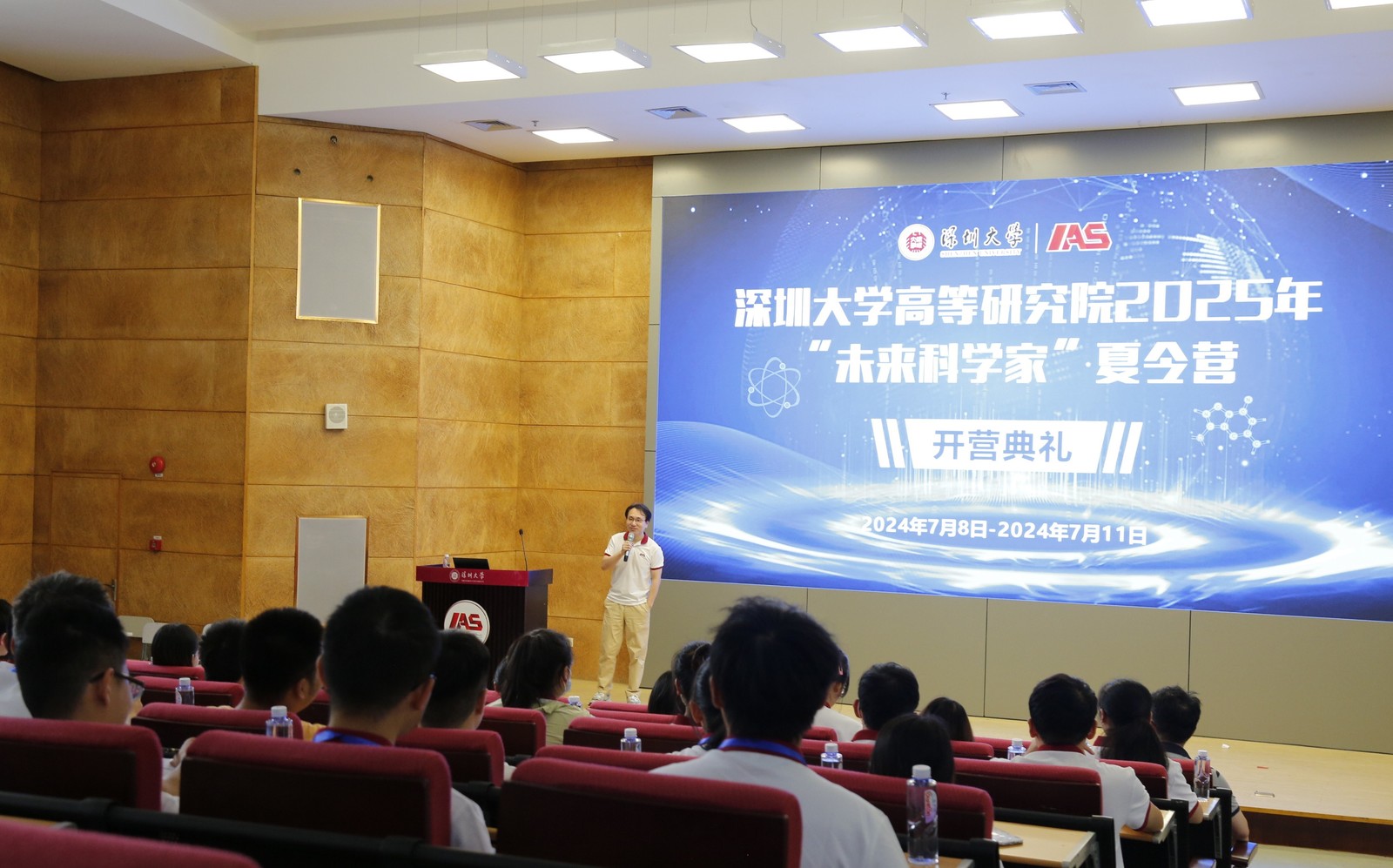 7月9日上午,深圳大学高等研究院2025年“未来科学家”暑期学校开营典礼在粤海校区南区举行。院长李猛、副院长李晓光,各学科教师代表朱平、丁春雨、周之超、尹国建、李昇隆,院办老师范雨婷、周乔、闻浩以及全体暑期学校学员参加了开营仪式。副院长李晓光致开营辞,首先对学员们的到来表示热烈欢迎,随后详细介绍了学院的发展历程、师资队伍、科研成果及研究生招生与培养的基本情况,旨在帮助学员们建立对学院研究方向的系统认识,充分了解高等研究院和深圳大学的最新面貌。