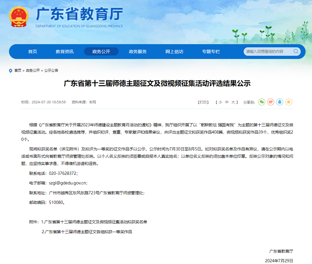根据《广东省教育厅关于开展2023年师德建设主题教育月活动的通知》精神,省教育厅组织开展了以“躬耕教坛 强国有我”为主题的第十三届师德征文及微视频征集活动。据悉,深圳市共有22个单位共29个作品获奖,其中主题正文获奖作品25篇,微视频获奖作品4个,优秀组织单位3个。