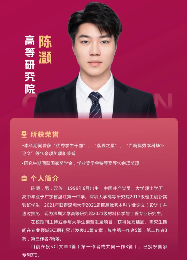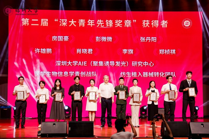 9月27日晚,深圳大学第二届“深大青年先锋奖章”颁奖仪式在演会中心举行,我院教师房国豪、仿生植入器械转化团队获得“深大青年先锋奖章”,2021级硕士研究生陈灏获“深大青年先锋奖章”提名奖。我院共推荐3个集体和个人参选,全部获得表彰。