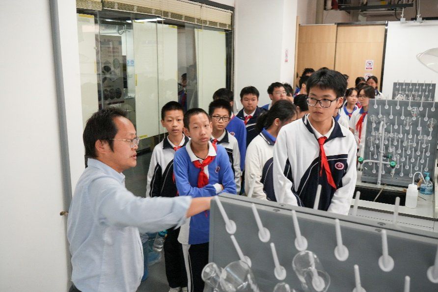 在基础化学教学实验室,同学们在高等研究院熊海老师和凌炜然同学的引导下有序参观。一流的实验环境以及精密的设备,让大家对化学学科产生了浓厚兴趣。熊老师耐心解答了同学们关于实验原理、仪器使用的疑问,将抽象的化学知识转化为直观的视觉体验,帮助青少年揭开化学实验的神秘面纱。