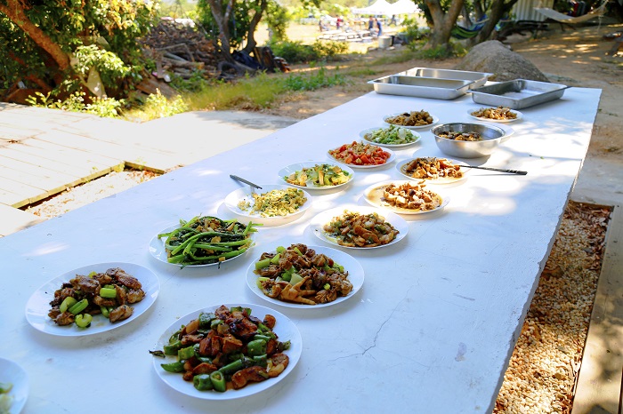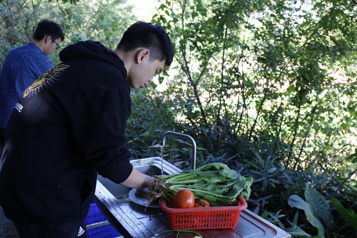 中午大家动手做起了午餐,由于在野外一切从简,因此大家需要一起完成劈柴、生火、洗菜、处理鱼、煮饭、炒菜等工作。只见擅长炒菜的几位同学驾轻就熟地拿起了锅和铲子,看着食材开始思考做哪些菜,其他同学也赶紧开始帮忙打下手。第一次用柴火煮饭,第一次用大锅炒菜,不少的“第一次”难倒了同学们,但在大家的通力配合下,丰盛的菜肴一道道地被端上了饭桌。