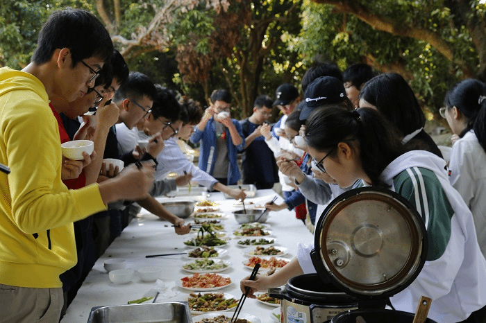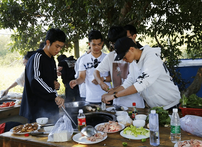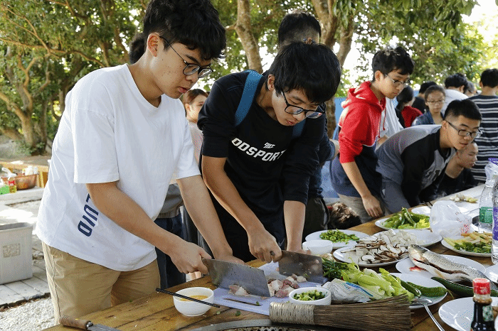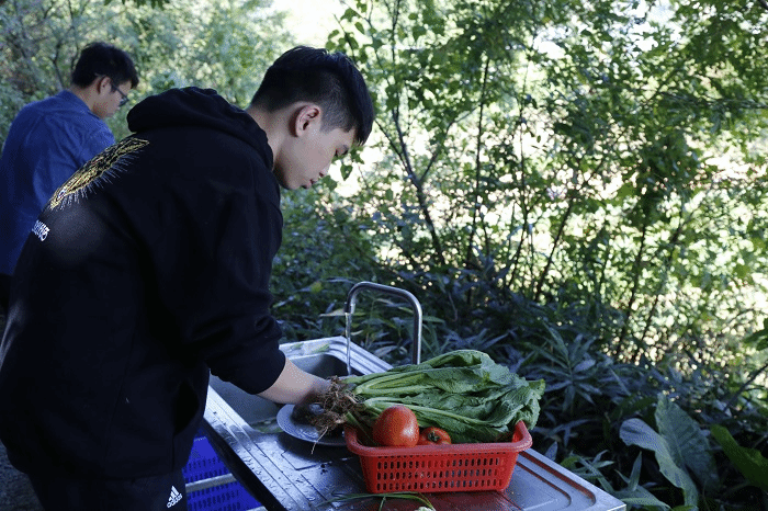 中午大家动手做起了午餐,由于在野外一切从简,因此大家需要一起完成劈柴、生火、洗菜、处理鱼、煮饭、炒菜等工作。只见擅长炒菜的几位同学驾轻就熟地拿起了锅和铲子,看着食材开始思考做哪些菜,其他同学也赶紧开始帮忙打下手。第一次用柴火煮饭,第一次用大锅炒菜,不少的“第一次”难倒了同学们,但在大家的通力配合下,丰盛的菜肴一道道地被端上了饭桌。