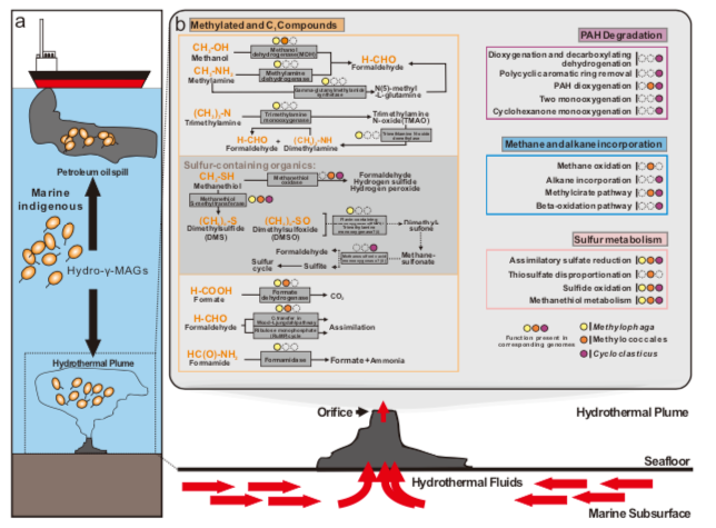 近日,深圳大学高等研究院李猛教授课题组在国际微生物学权威期刊《The ISME Journal》(Nature Index 收录期刊,2019年影响因子:9.18,中科院一区)发表了题为“Gammaproteobacteria mediating utilization of methyl-, sulfur- and petroleum organic compounds in deep ocean hydrothermal plumes” 的研究论文。该论文结合基因组、转录组和化学光谱分析技术深入探讨了三类γ-变形菌在深海热液羽流中对甲基化合物、含硫有机物及石油有机物的降解功能。深圳大学高等研究院李猛教授为论文通讯作者,团队成员周之超博士为第一作者,深圳大学为第一完成单位。同时,该工作还有美国威斯康星大学、密西根大学、明尼苏达大学等研究学者参与,共同合作完成。