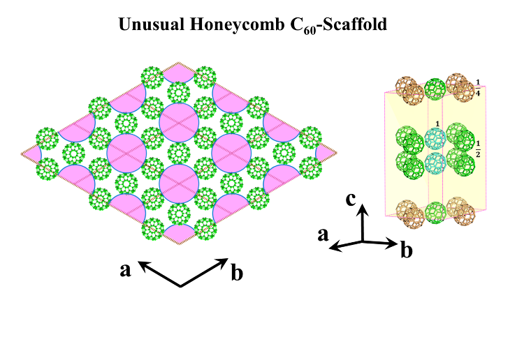 形状两亲物是一类分子,包含不同几何形状的结构模块。这些具有不同形状的结构模块被迫通过化学键连接,导致竞争和相互作用的协同组装,形成了有趣组装结构。 在这项工作中,我们设计并合成了由C60和三亚苯基(C60-TP)组成的球形/三角形两亲物。 C60-TP超结构属六方晶系,其晶胞参数为a = b = 1.98 nm,c = 4.52 nm和γ= 120°的参数。 另外,该研究通过精准的多角度电子衍射技术,首次展现了带有新型蜂窝C60支架的三维分层结构。蜂窝状骨架C60的配位数调整为4,而不是在传统的C60六方紧密堆积的配位数6。 这种新型的非紧密型堆积的六方排列是由于TP部分排列时产生的空间效应而形成。 该研究可以为调整三维结构中的对称性提供一般的指导含义。