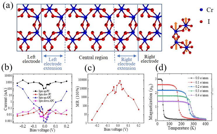 图注:(a) 单原子层CrI3自旋输运模型示意图。(b)自旋输运、(c)磁阻率及(d)原子磁矩与温度关系曲线受到空穴掺杂的影响。