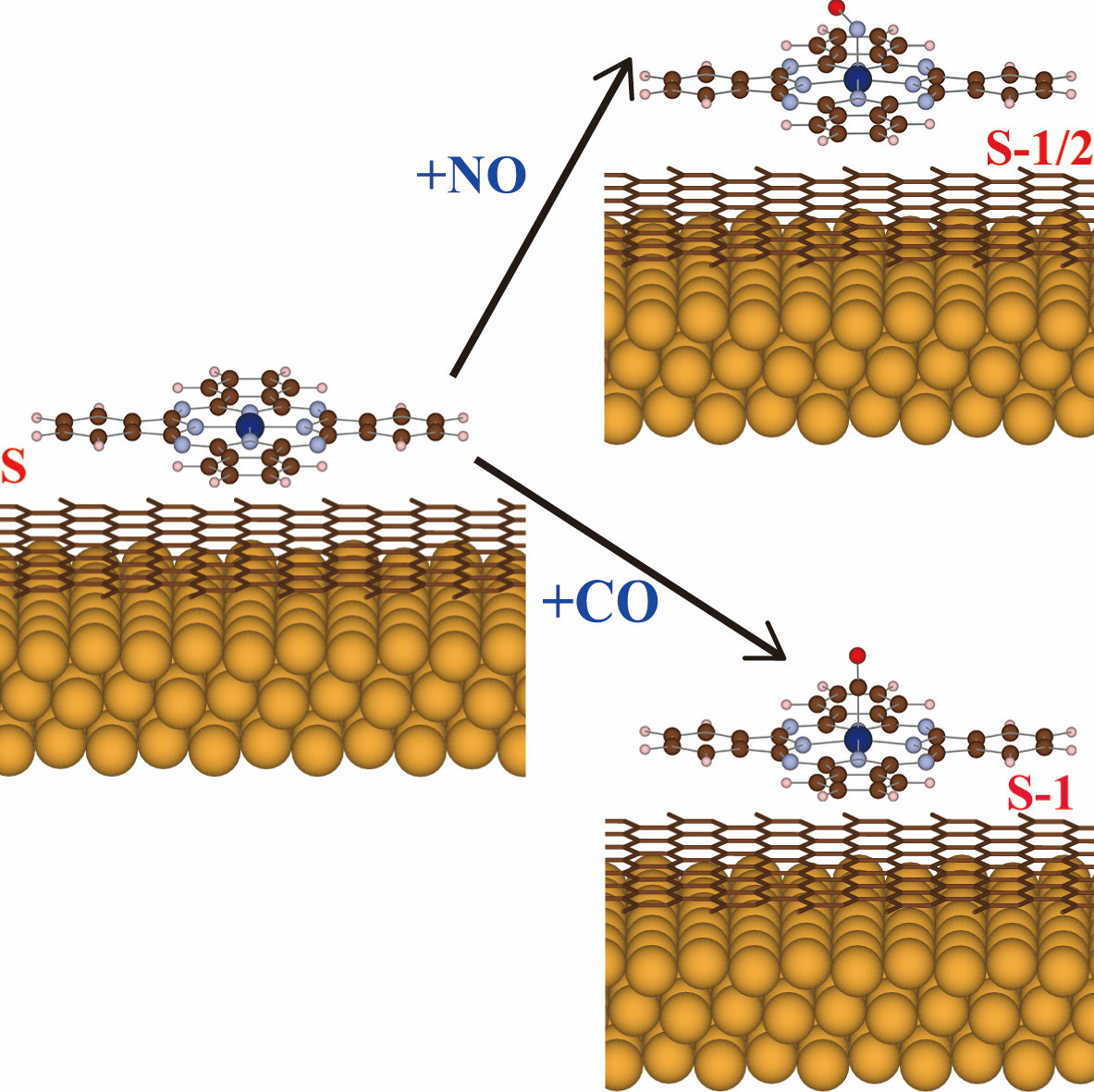在前期工作基础上[Phys.Chem.Chem.Phys.21,5424 (2019)],研究团队以过渡金属酞菁分子吸附石墨烯/金属金复合衬底为对象,进一步考虑额外的CO和NO小分子吸附对体系电子结构,尤其是分子自旋和磁性的影响。通过第一性密度泛函理论计算,实现了分子自旋从S到S-1/2或者S到S-1的精确调控。同时综合使用分子轨道理论和主相互自旋-轨道分析方法对吸附体系的几何构型以及分子自旋极化的变化进行了解释。该研究为精确调控单分子自旋态提供了有效途径,为相关实验提供了重要的启示,对设计与二维材料相集成的单分子自旋电子学器件具有重要指导意义。