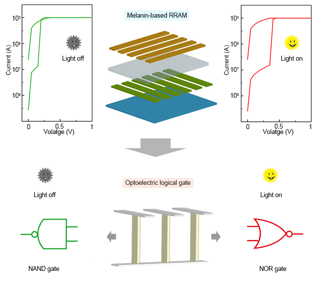 结构简化,功能化和多样化是后摩尔时代电子存储技术发展的主要趋势。由于结构简单,易于集成和经济高效的可制备性,光电阻变存储器件被认为是传统的基于硅的存储器的最有吸引力的替代方案之一。在这项工作中,课题组介绍了一种基于天然黑色素的光电存储器件,该器件具有良好的电学和光学特性。该器件显示出可重复的双极电阻式开关,光可调的SET电压。基于这种光调制的特性,成功在单个基于阻变器件的电路中实现了光场驱动的NAND和NOR逻辑功能。由于光可调的开关特性,再加上天然生物材料的生物相容性,这项工作为下一代高性能光电存储器及光电器件的开发和集成提供了新思路。