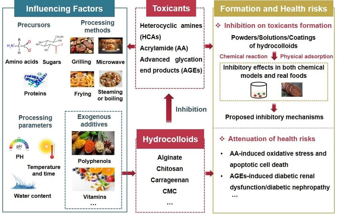 该综述聚焦于食品中三类典型有害物质(HCAs、AA和AGEs),首先,概括了影响其生成的主要因素,包括前体物质、加工方式/参数和外源添加剂,其中,重点强调了不同形式的亲水胶体(粉末、溶液和涂层)对有害物质生成的有效抑制作用和机制。其次,进一步阐明了亲水胶体对有害物质诱导的健康风险的减弱作用,包括氧化应激、糖尿病肾病等。最后,总结了未来仍需深入研究的方面,包括亲水胶体与有害物质生成之间的构效关系、与典型多酚的协同抑制作用及其对有害物质生物利用度的影响。这项工作得到了国家重点研发计划(2016YFD0400204),国家自然科学基金(31871901),广东省重点研发计划(2019B020212001),广东省珠江人才计划(2019ZT08H476)和深圳市孔雀团队项目(KQTD20180412181334790)的支持。