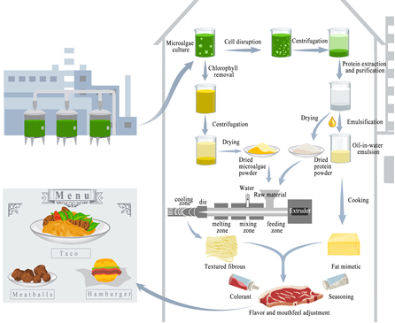 近两年,为了缓解日益增长的肉类消费需求,人造肉作为一种更健康、更可持续的肉类替代品应运而生。微藻作为一种新型的蛋白质资源,有望成为人造肉的原料。在这篇综述中,作者展望了利用微藻作为原料生产人造肉的潜力和挑战。文章包含四个部分。第一部分阐述了微藻作为人造肉原料的特性,分析使用微藻制作人造肉的可行性。第二部分回顾了用于食品原料的微藻的培养和生产。第三部分比较了用于生产植物基人造肉的技术,并强调了以微藻为原料的可能生产路线。最后一部分讨论了微藻生产人造肉所面临的经济和技术挑战,并提出了一些可能的解决方案。从营养角度来看,微藻是生产人造肉的优良原料。微藻富含蛋白质和多种高附加值产物,利于生产具有高营养价值的人造肉。目前,生产微藻基人造肉的主要挑战是技术路线不完整。将微藻加工成类肉纤维的织构技术仍旧处于早期阶段,亟需进一步的研究。