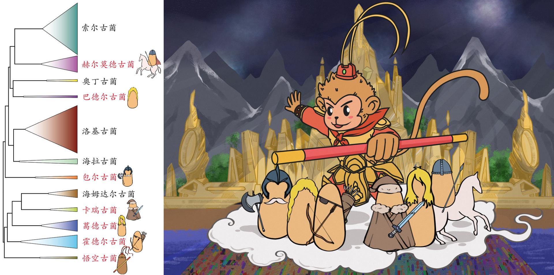 最初的五个阿斯加德古菌门类均以北欧神话中的神命名,包括洛基古菌、索尔古菌、奥丁古菌、海姆达尔古菌和海拉古菌等。李猛教授课题组于2020年初在我国红树林湿地沉积物中率先发现了第六个阿斯加德古菌门,将其命名为葛德古菌(Gerdarchaeota,女巨人)。在此基础上,李猛教授课题组与Eugene Koonin教授课题组等开展深入合作,对现有基因组和不同环境样品的宏基因组进行整合分析,获得了162个高质量的阿斯加德古菌基因组,其中75个属于尚未报道的新基因组,从中发现了6个尚未被报道的阿斯加德古菌新门,其中5个门类分别以北欧神话的神命名为赫尔莫德古菌(Hermodarchaeota,赫尔莫德:神使)、巴德尔古菌(Baldrarchaeota,巴德尔:光明之神)、霍德尔古菌(Hodarchaeota,霍德尔:黑暗之神)、包尔古菌(Borrarchaeota,包尔:奥丁的父亲)和卡瑞古菌(Kariarchaeota,卡瑞:风之神),还有一个更为古老的阿斯加德古菌新分支则以中国古典名著《西游记》中大闹天宫的齐天大圣“孙悟空”的名字命名为悟空古菌(Wukongarchaeota),以彰显我国文化自信。分析表明,悟空古菌具备氢氧化的化能自养代谢潜能,显著区别于其他阿斯加德古菌混合营养或异养的代谢模式,这也是将其命名为中国神话人物的原因。