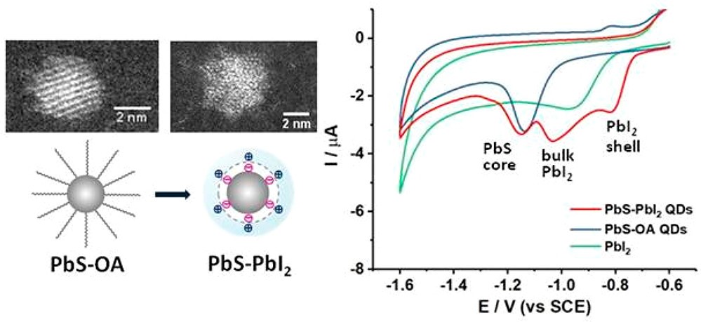 图一 PbS-OA和PbS-PbI2的TEM图、示意图以及两者的典型循环伏安图。