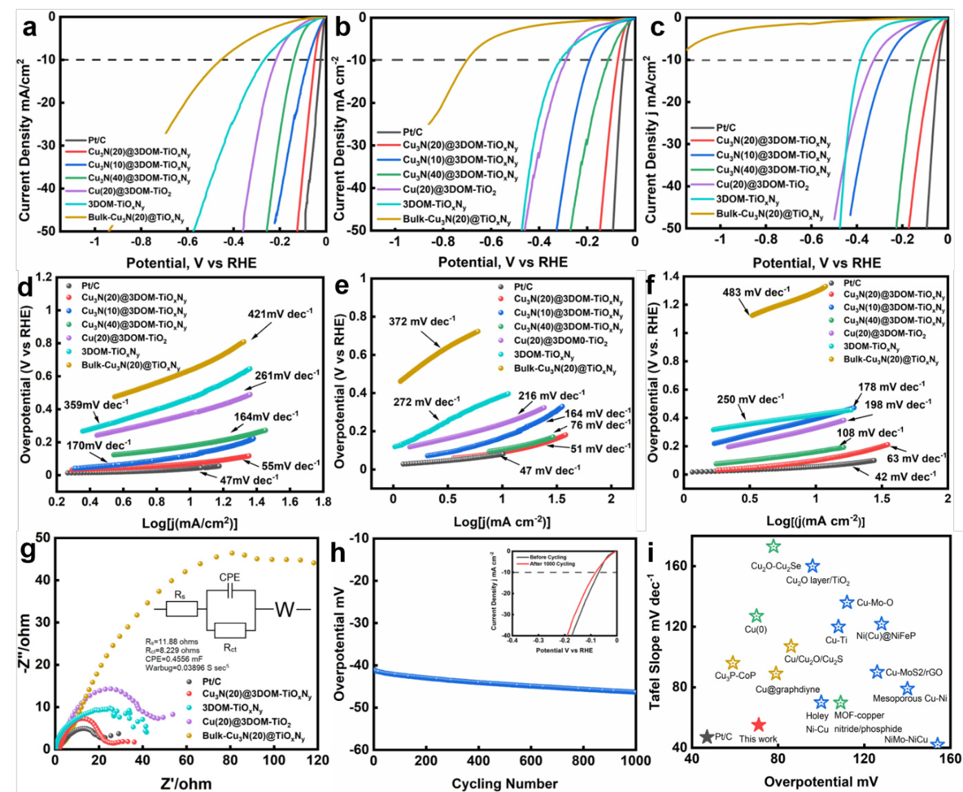 图2. Pt/C, Cu3N(10/20/40)@3DOM-TiOxNy, Cu(20)@3DOM-TiO2, 3DOM-TiOxNy,和 bulk-Cu3N(20)@TiOxNy 催化剂在 (a), (d) 1 M PBS; (b), (e)1 M KOH; and (c), (f) 0.5 M H2SO4 下的线性极化曲线(LSV);(g) EPt/C, Cu3N(20)@3DOM-TiOxNy, 3DOM-TiOxNy, Cu(20)@3DOM-TiO2 and bulk-Cu3N(20)@TiOxNy的电化学阻抗(EIS)和等效电路模拟; (h) Cu3N(20)@3DOM-TiOxNy的1000次循环稳定测试; (i) 文献报道的不同酸(黄)、碱(蓝)、中性(绿)的电解液下,Cu基催化剂在10 mA cm-2 电流密度下的过电位以及 Tafel slope 的比较。