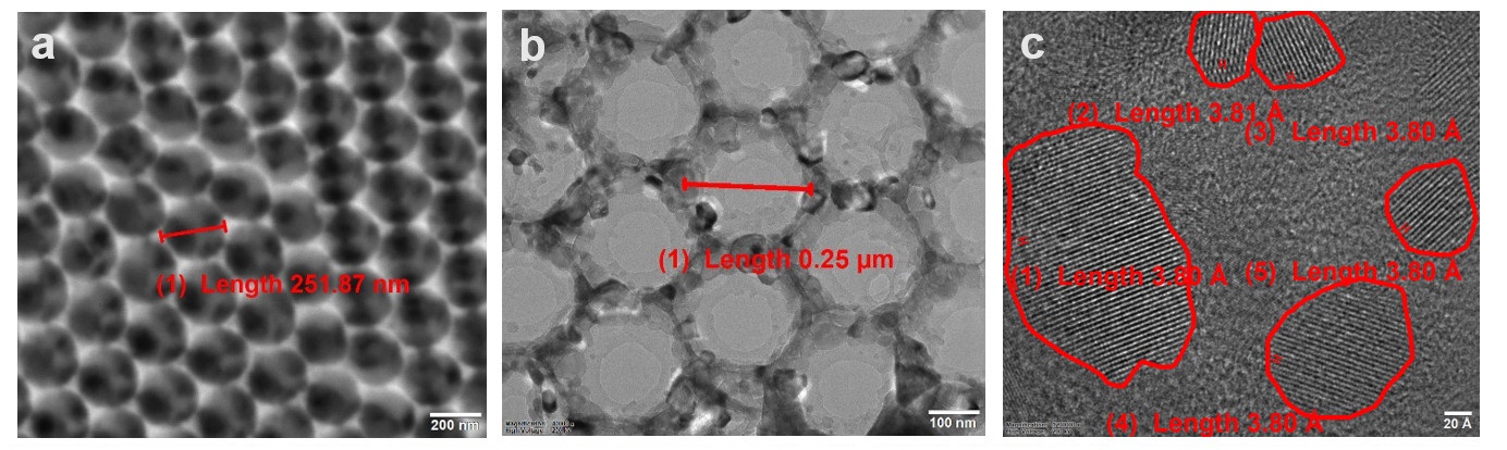 图1 a) & b) Cu3N@3DOM-TiOxNy的SEM和TEM照片;c) HRTEM下,催化剂表面分布的Cu3N晶体。