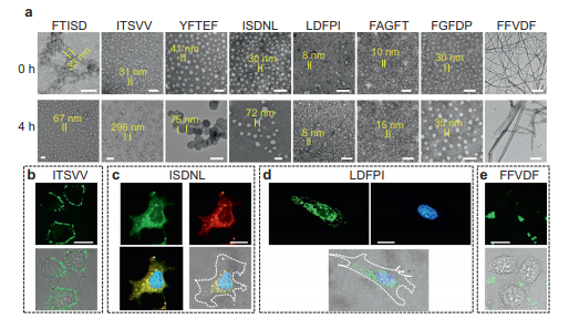 图2 蛋白短肽自组装纳米结构转化以及在细胞内的分布。