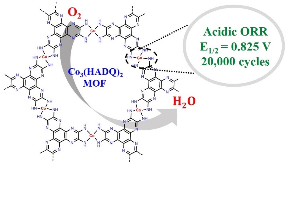 本研究首次合成了一种结构如上图所示的二维金属有机框架化合物(2D MOF),命名为Co3(HADQ)2,该通过金属Co原子与4个N原子配位成键,在二维平面里,重复结构单元,形成MOF结构,该平面二维结构堆叠在一起,在三维空间里形成类似石墨的层状结构材料。本研究中,将该新型Co-MOF材料作为酸性环境下ORR反应的电催化剂,发现其氧还原的半波电位和商业碳载铂催化剂相差无几,但是其循环充放电至少达到20000次(120个小时)以上而几乎没有任何衰减,在酸性环境下表现出极强的稳定性(酸性环境为商业化质子交换膜氢燃料电池的工作环境),并结合理论计算,阐明了催化活性位点及反应机理。