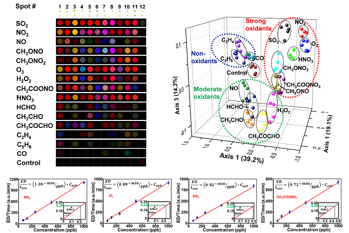 实验验证12种金纳米墨水都具备稳定的化学性质,贮存6个月内未观察到明显的聚沉现象;印制的阵列随后组装成一次性检测微器件,随后搭建基于便携式微型设备的简易光学信号采集装置,对阵列传感器反应前后的红、绿、蓝色光学信号进行方便快捷的扫描、分析和建库,可在500 ppb浓度级别特征性区分15种不同的光化学气体及其混合物,检测限低至1 ppb以下。反应强度主要取决于检测气的氧化性,越强氧化性的污染气,响应平均强度越高。而对于弱氧化性或还原性气体(如乙烯、异戊二烯等),响应图案较弱,几乎可忽略不计。依据这些气体化合物的氧化性质,呈现出差异性的响应图案,以此可以建立分子指纹式的物质分析机制,对不同光化学气体进行鉴定和归类。