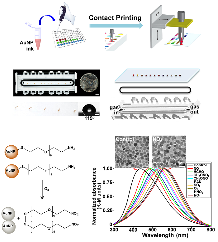 基于以上背景,深圳大学高等研究院李正研究员团队通过湿法合成一系列不同配体功能化的金纳米材料,开发了一类基于表面等离子共振信号(LSPR)的气敏光学传感器。利用金纳米敏感的LSPR性质在气-固表面与光化学污染物反应时的改变,实现对大多数光化学污染气的超灵敏检测与鉴别。修饰的金纳米材料在空气中性质稳定,具有较高的憎水性,有效地阻止传感器使用中来自外界水气的干扰。通过此法得到12种不同光电性质的传感材料,在疏水化玻片上通过接触式打印制备阵列式传感器,构建用于气相检测的芯片实验室,并通过电子显微镜与光谱学表征,初步探究了气固表面反应机制(图1)。