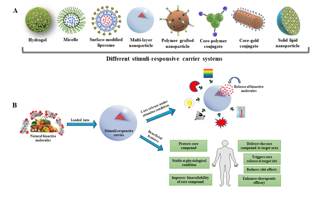 图1.A: 不同类型的刺激响应载体系统的示意图;B: 刺激响应载体系统及与传统载体在释放活性物质方面的优势对比