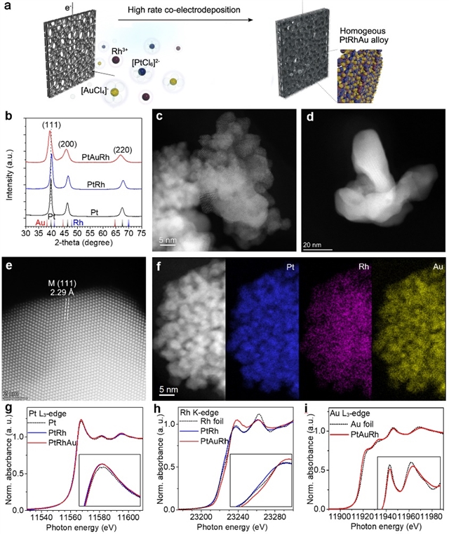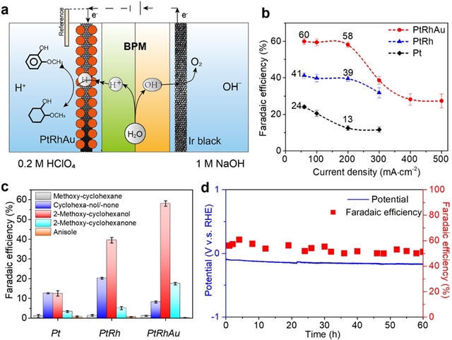 实验结果显示,PtRhAu电催化剂在电流密度为200 mA cm-2时,木质素单体愈创木酚合成2-甲氧基环己醇的法拉第效率(FE)达到了创纪录的58%,与以往报道的最高生产率相比,FE提高了1.9倍,分电流密度提高了4倍。