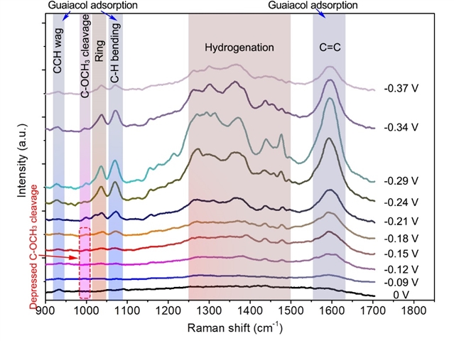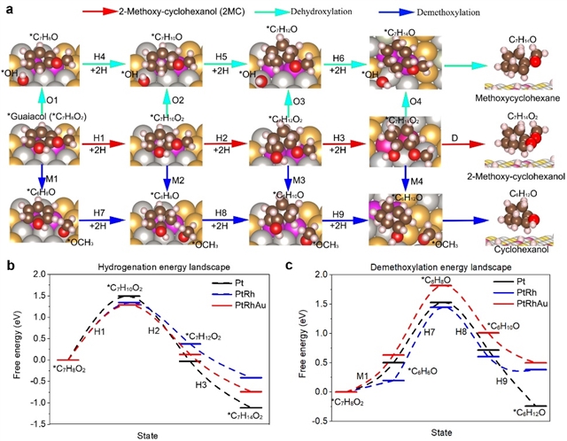 研究人员利用X射线吸收光谱研究了Rh和Au对Pt电子结构的影响,利用原位拉曼光谱研究了催化剂表面催化反应机理,发现Rh和Au可通过调节催化剂表面的吸附能来促进木质素单体的吸附和加氢,并且抑制C-OCH3键的断裂。