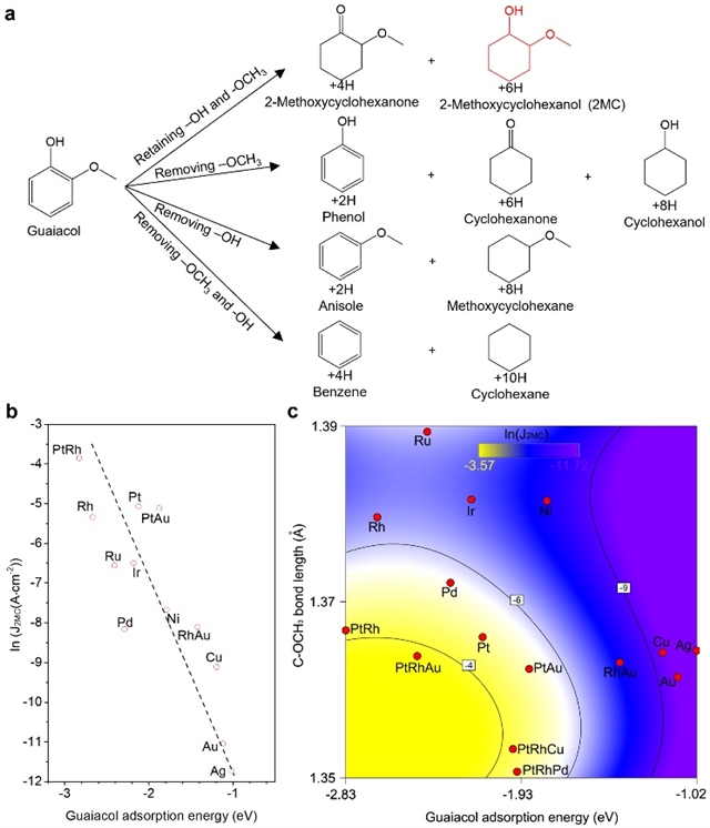 近日,深圳大学高等研究院的赵伟,加拿大多伦多大学Edward H. Sargent,洛桑联邦理工学院Jeremy S. Luterbacher报道了木质素单体在可再生电力驱动下选择性ECH为甲氧基化增值化学品的研究。先前的研究虽然迅速推进了该领域发展,然而,迄今为止,仍然缺乏所需的选择性:即当木质素衍生的甲氧基化单体加氢生成甲氧基环己烷时,所需的甲氧基(-OCH3)也被同时还原切除。基于此,研究人员通过密度泛函数理论计算结果作为指导,筛选了多种合金,开发了一种可选择性地将木质素单体加氢生成甲氧基环己烷的三元PtRhAu电催化剂。