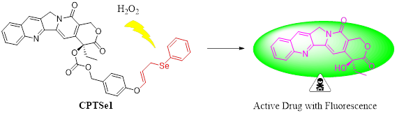 活性氧(ROS)响应性前药因其靶向肿瘤可减轻化疗副作用的性能而备受广泛关注。在此研究中,一系列可被H2O2激活的新型诊疗一体化前药(CPTSe1-CPTSe7),被合成和优化,这些前药包含了可作为H2O2受体的烯丙基苯基硒化物(见图1)。与传统的基于硼酸酯的前药CPT-B相比,CPTSe1在人体血浆内更稳定;并在H2O2诱导实验中显现出药物-喜树碱(CPT)的更充分释放,肿瘤细胞中CPTSe1的选择性激活荧光信号有助于实时监测CPT的释放和H2O2检测(见图2)。